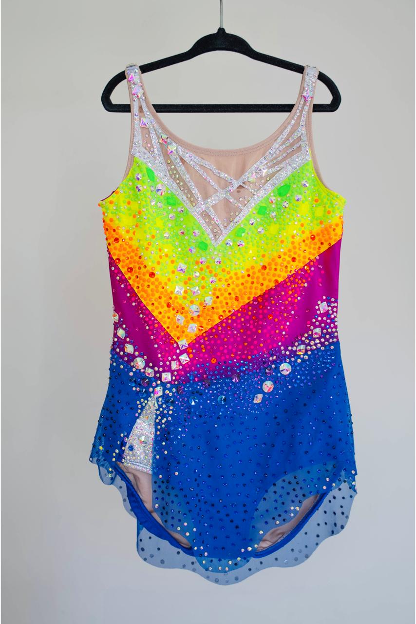 Criado em degradê multicolorido, o modelo mistura tons de rosa, amarelo, azul e lilás, formando um visual alegre e envolvente. As aplicações de cristais cintilantes acompanham o desenho da peça e refletem a luz em cada movimento, tornando a coreografia ainda mais encantadora.