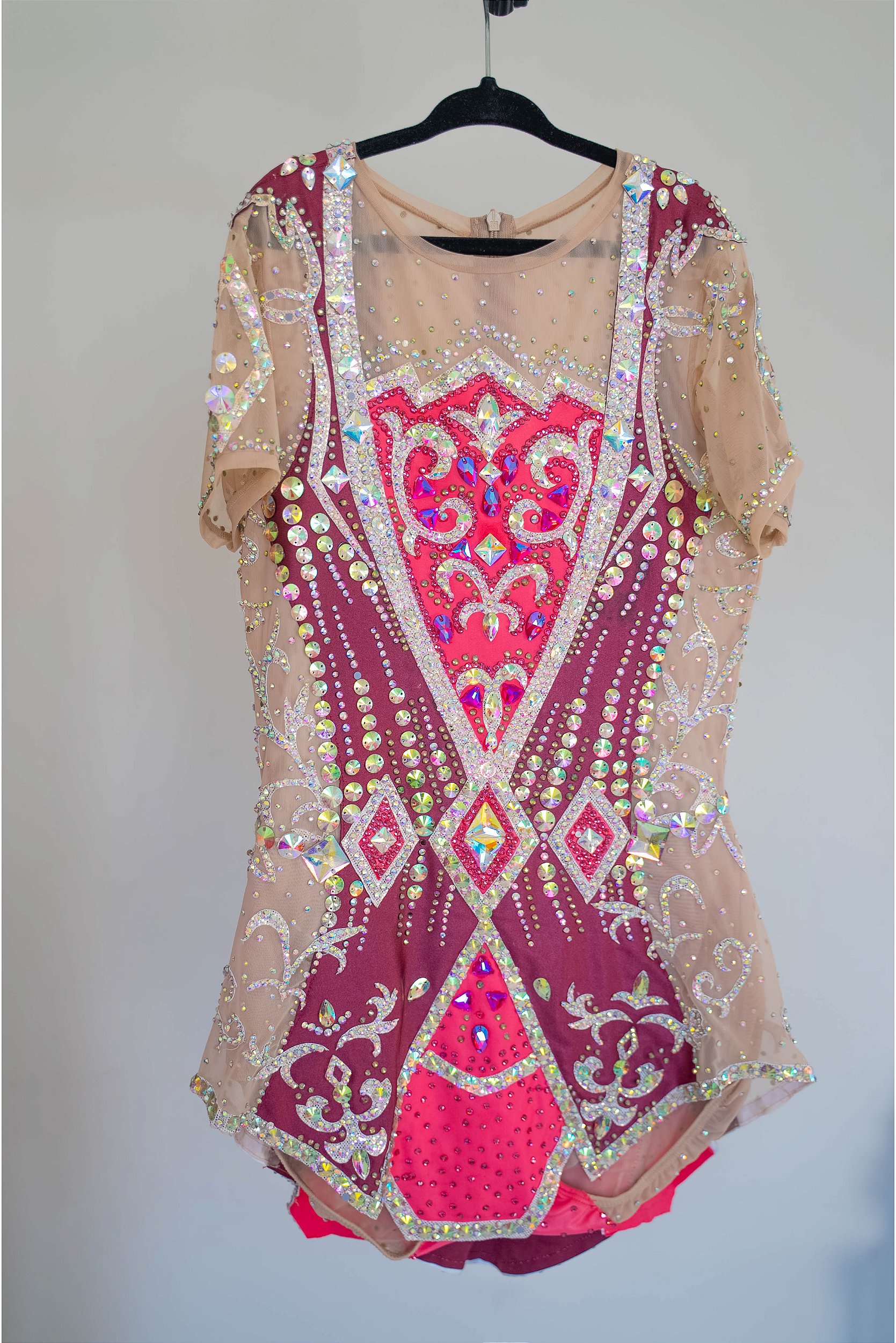 O Collant Marsala e Rosa com Cristais Holográficos é uma criação artesanal do Lieko Ateliê, pensada para atletas que buscam presença cênica e sofisticação em competições de Ginástica Rítmica.